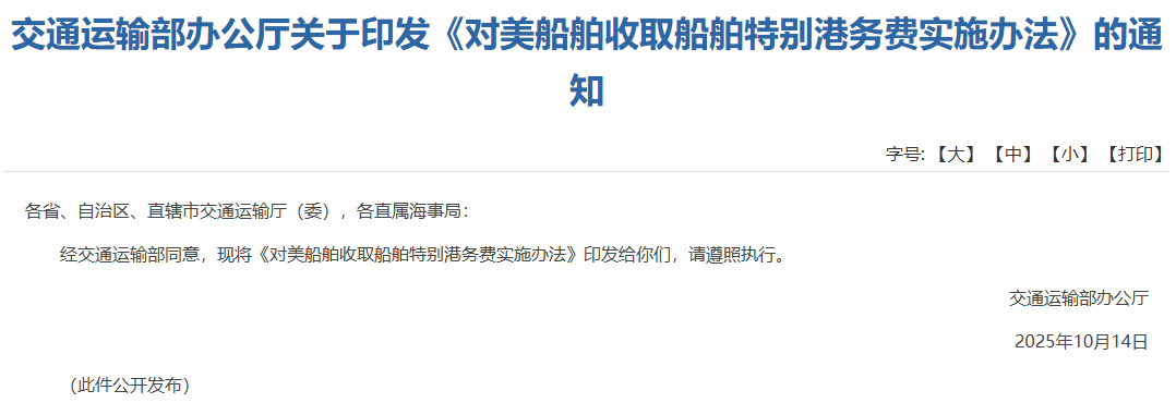 当日凌晨,交通运输部发布《对美船舶收取船舶特别港务费实施办法》。《办法》共十条,自发布之日起施行,主要包括制定依据、收取范围、收取标准、收取主体、缴费航次、缴费要求、信息核实、违规处理、动态调整、解释部门和施行时间等内容,进一步明确了由中国建造的船舶、仅进入中国船厂修理的空载船舶,以及其他经认定予以豁免的船舶免予缴纳的具体规定。