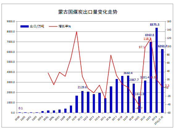 据蒙古国海关机构(Mongolian Customs Service)发布的统计数据显示,2025年1-9月,蒙古国煤炭出口量累计为6261.68万吨,比上年同期增加139.2万吨,同比增长2.3%。