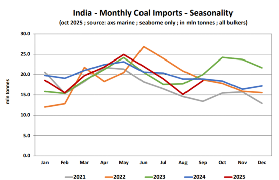根据AXS Marine船舶跟踪数据,2022年,印度海运煤炭进口量达到22540万吨,同比增长10.3%;2023年,进口煤炭24080万吨,同比增长6.9%。然而,2024年全年,印度煤炭进口量降至23650万吨,同比下降1.8%;今年前9个月进口量为17540万吨,同比下降4.9%。