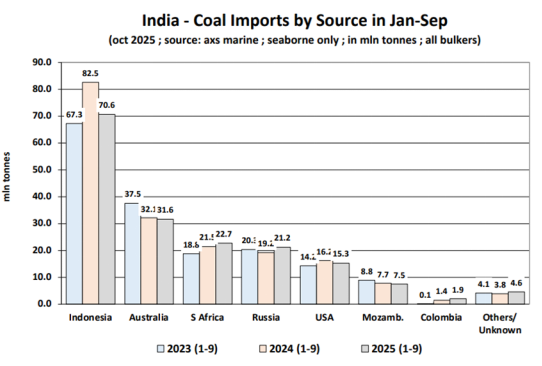 由于商业和政治因素,印度进口贸易格局也相应发生变化。印度尼西亚继续是印度最大的煤炭进口来源国,2025年前9个月,印度从印度尼西亚进口的煤炭同比下降14.4%,降至7060万吨,但仍高于2023年1月至9月的6730万吨,占印度同期煤炭总进口量的40.3%。
