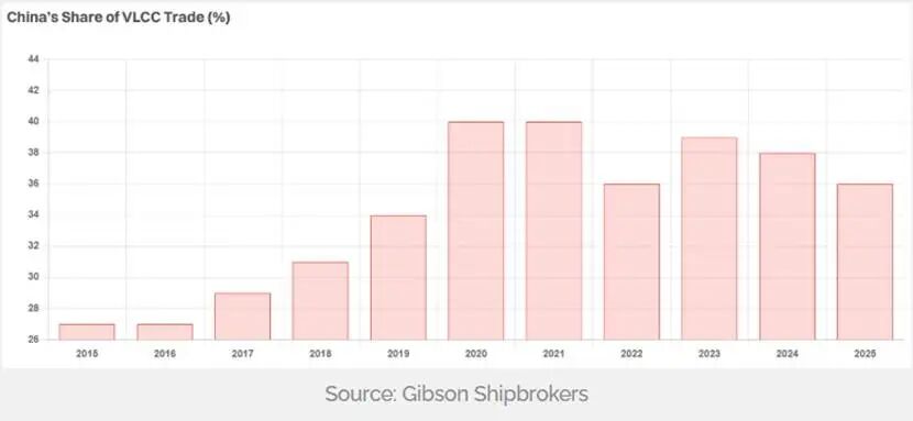 VLCC面临的风险最大,因中国是其最大出口目的地,去年占该船型贸易量约38%。其他船型亦受波及,但程度较轻,因其贸易模式更多元,对华依赖度较低。短期内,船队能否安全进入中国市场的不确定性,或将加剧运费波动。VLCC运力本已高度紧张,这得益于欧佩克+原油增产、炼油厂检修、中东削减用于发电的直接原油消耗,以及9月大西洋盆地原油东向运量激增。