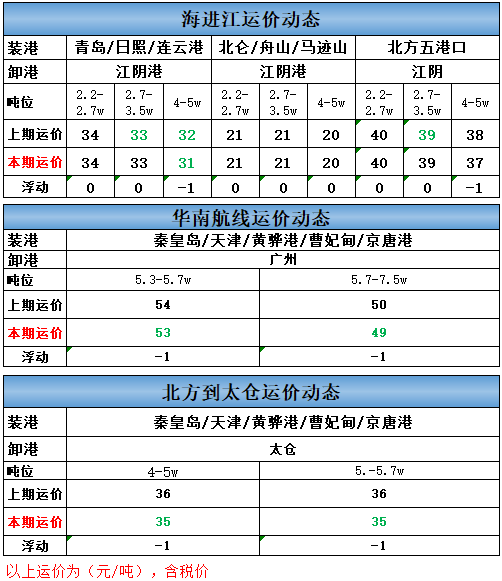 北方到太仓航线4-5万运价下跌1元;5-5.7万吨运价下跌1元;