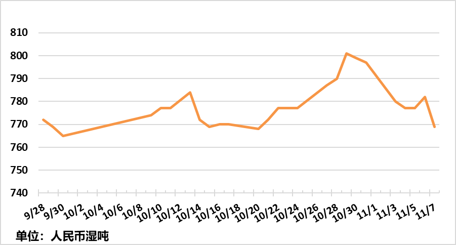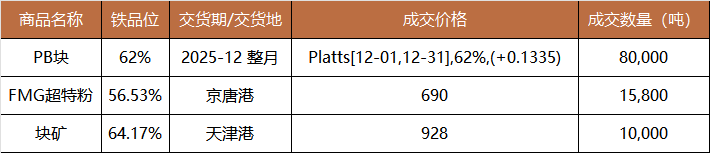 2025年11月12日,平台成交14笔共28.48万吨,其中在途现货(美元)1笔共8万吨;港口现货(人民币)13笔共20.48万吨。 北铁指数(61% 青岛):777.00元/湿吨(+9.00),美元折算价101.81美元/干吨(+1.27);北铁指数(61% 曹妃甸):787.00元/湿吨(+7.00),美元折算价102.81美元/干吨(+0.99)。