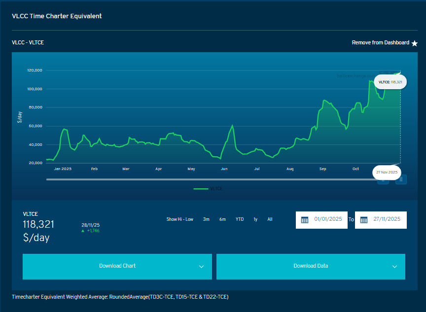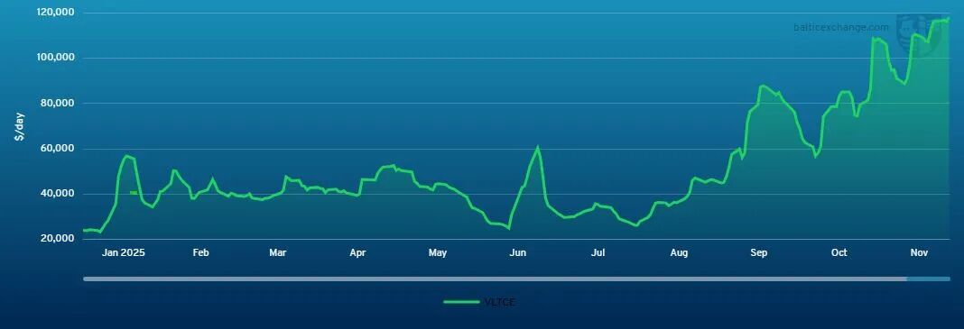 进入2025年四季度,VLCC市场迎来了一轮几乎席卷全球的强势上涨行情。从波罗的海交易所的收益曲线、到主流经纪公司的即时成交案例,再到船东财报中所透露的信息都显示,VLCC运费正在呈现出“连续加速、全面走强”的趋势。这波行情不仅推动租金冲向五年来的最高区间,也成为驱动全球船东疯狂下单VLCC的重要根本原因。