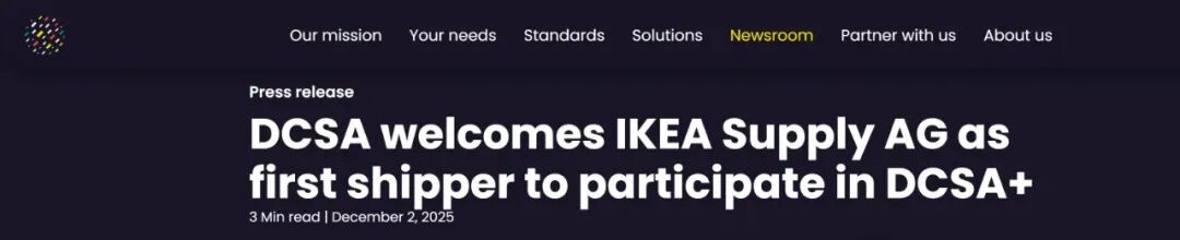 12月2日,数字集装箱运输协会DCSA宣布,全球知名货主企业宜家IKEA已正式加入其合作伙伴计划 DCSA+,成为首家加入该计划的全球知名货主企业。