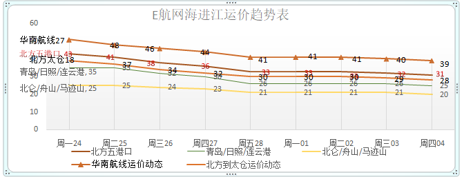 (绿色字体代表运价下调,红色字体代表上浮)沿海运价本周走势图