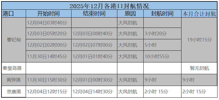 2025年12月04,近期北方曹妃甸频繁短时间大风封航,京唐港也短时间封航,其他各大港口暂无封航:
