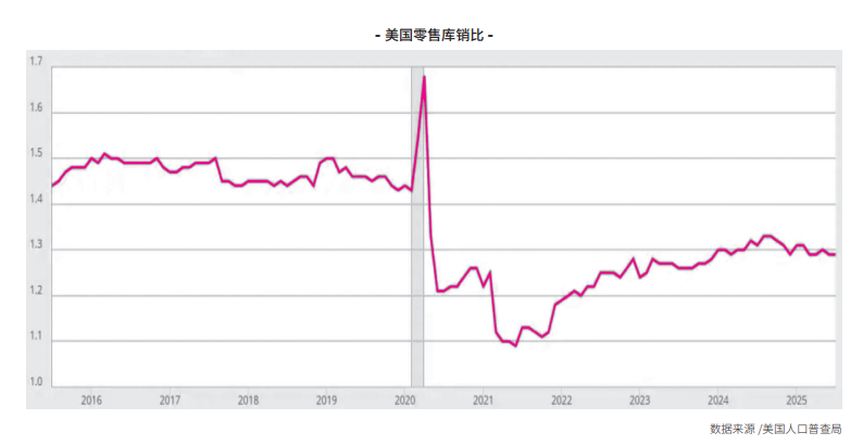 先来看美国零售库销比。由于美国政府部门关闭了一段时间,目前最新公布的只有2025年7月份的数据,比值为1.29,远低于疫情前1.45左右的水平。