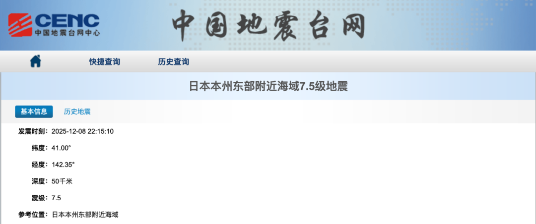 中国地震台网正式测定:12月08日22时15分在日本本州东部附近海域(北纬41.00度,东经142.35度)发生7.5级地震,震源深度50千米。