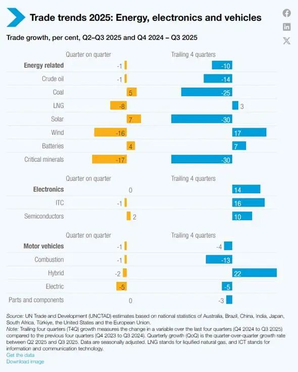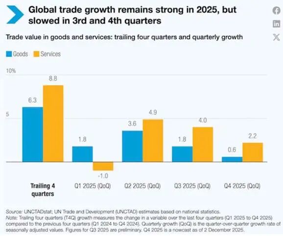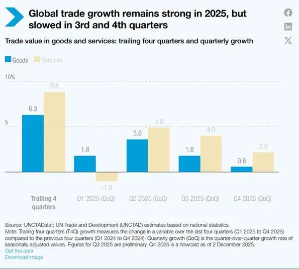 展望2026年,鉴于全球经济活动降温、债务水平上升、贸易成本增加,以及持续的不确定性因素对贸易活动构成压力,联合国贸发会议预计全球贸易增长将放缓。