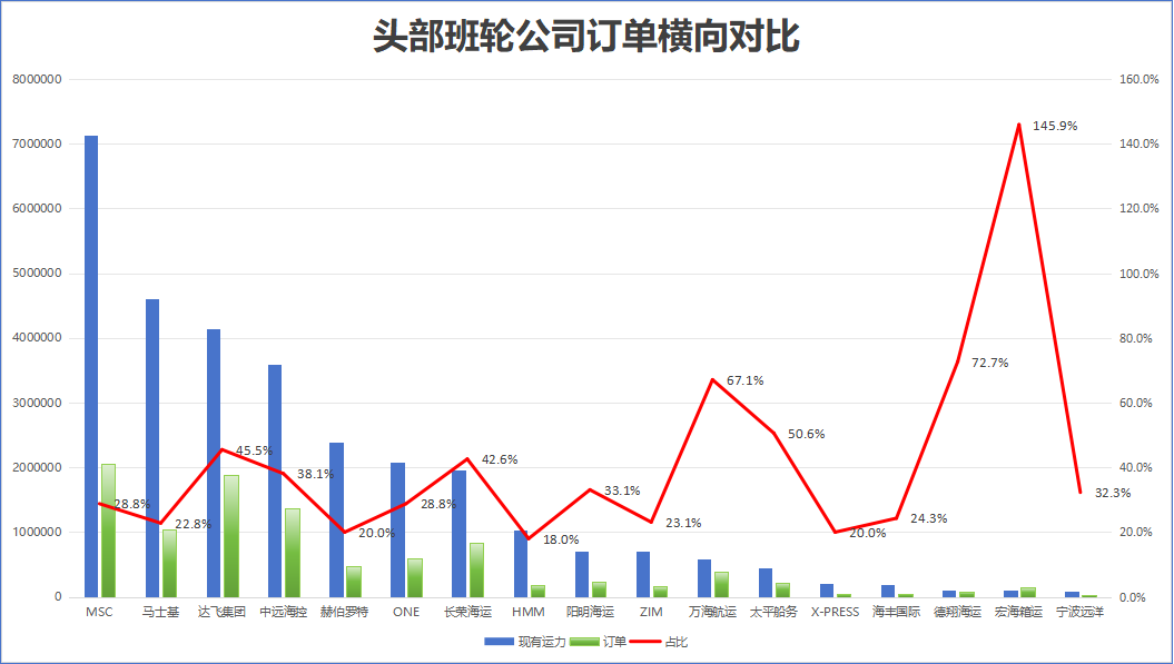 截至目前,地中海航运手持订单量最大,达到114艘或205万TEU,相当于其现有船队的28.8%。达飞集团手持订单148艘或188.4万TEU,占现有运力45.5%;中远海运的手持订单量93艘或136.8万TEU,占现有运力的38.1%;马士基目前的手持订单80艘,105.1万TEU,占现有总运力的22.8%;赫伯罗特目前的手持订单58艘,47.7万TEU,占现有总运力的20.0%。