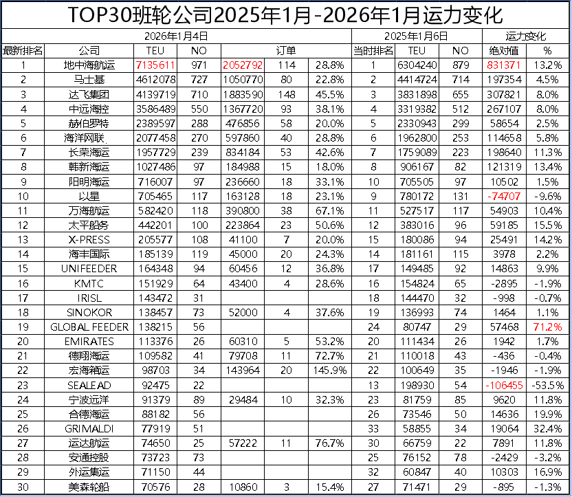 2026年新年伊始,我们简单盘点一下头部班轮公司(TOP30)运力规模的变化。