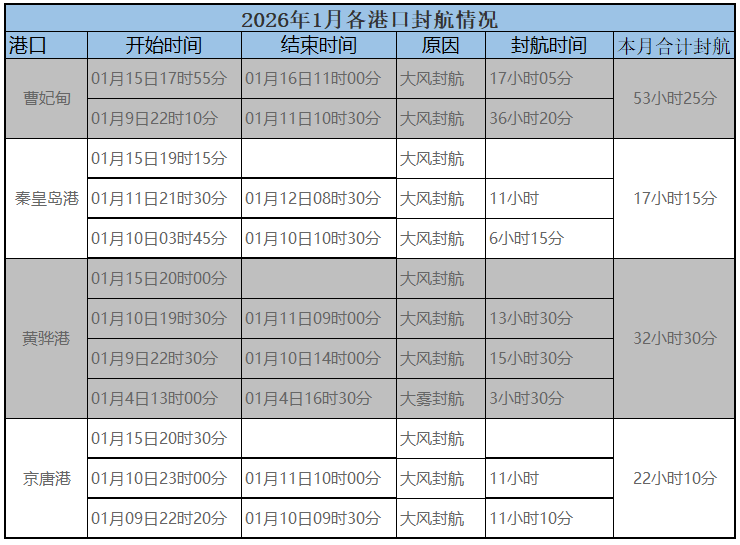 2026年1月中旬,近期北方各大港口均有大风封航,具体如下。