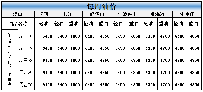 本周运河长江轻油价格均无变化。
