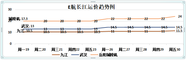 本周长江下水武汉运价上涨1元。岳阳,荆州,宜昌运价上涨2元。其他各航线运价暂维持稳定;