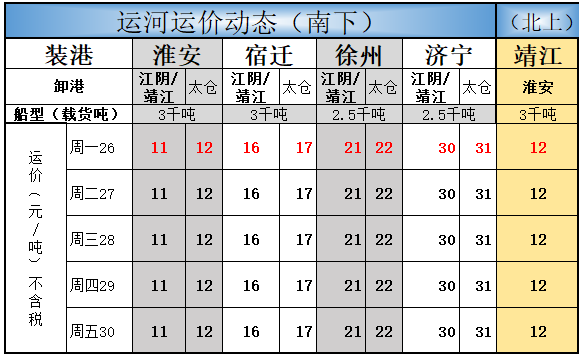 济宁到靖江运价上涨4元为30元/吨。