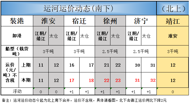 济宁到江阴/靖江运价上涨1元为31元/吨;
