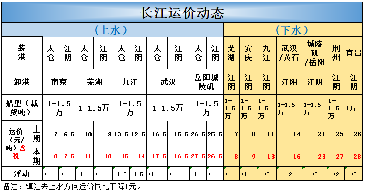 长江下水各航线运价均上涨;其中芜湖安庆到江阴上涨1元,其他上游航线运价上涨2元!