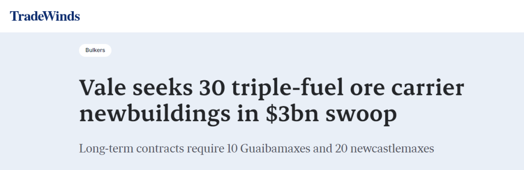报道援引一位航运业人士的消息称,淡水河谷已就20艘21万载重吨Newcastlemaxes型VLOC和10艘32.5万载重吨Guaibamaxes型VLOC发出招标,这些船舶的租期均在25年或以上。上述船舶将采用高硫燃料油、乙醇或甲醇作为燃料,并要求具备LNG或氨燃料预留设计,技术规格很高,还将装配洗涤塔、旋筒帆、空气润滑系统、轴带发电机、节能装置等。
