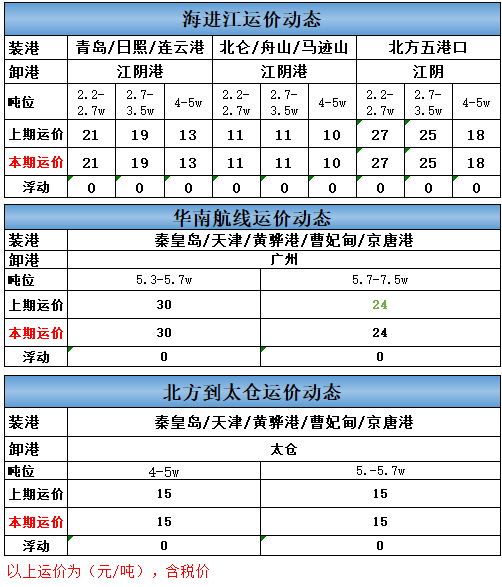 北方到太仓航线4-5万运价无变化; 5-5.7万吨运价无变化;