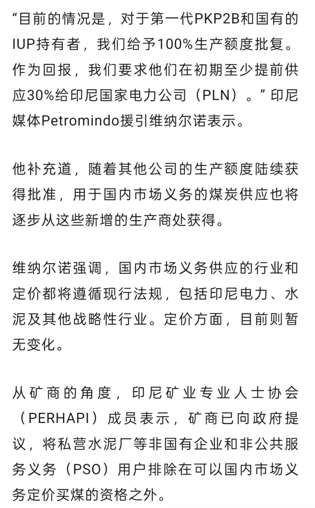 据外媒报道,印尼能源与矿产资源部(ESDM)煤炭与矿产司司长特里·维纳尔诺(Tri Winarno)表示,该部已批准了第一代持有煤炭开采特许经营协议(PKP2B)及采矿业务许可证(IUP)的国有矿业公司100%的年度生产额度,但要求这些企业预先划拨至少30%的煤炭产量以履行国内市场义务(DMO),供应国内电力企业。“目前的情况是,对于第一代PKP2B和国有的IUP持有者,我们给予100%生产额度批复。作为回报,我们要求他们在初期至少提前供应30%给印尼国家电力公司(PLN)。” 印尼媒体Petromindo援引维纳尔诺表示。