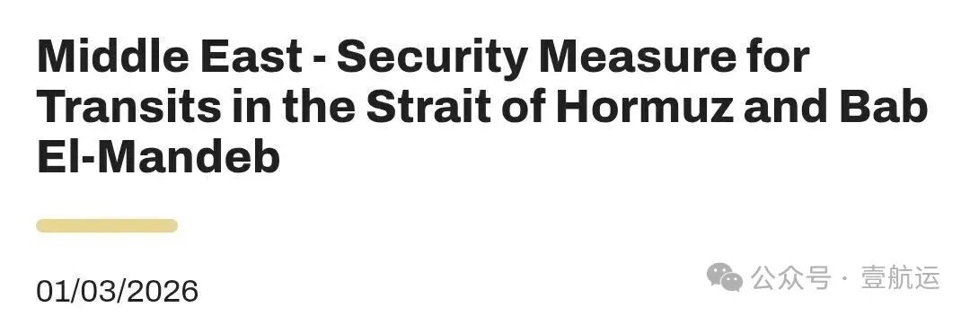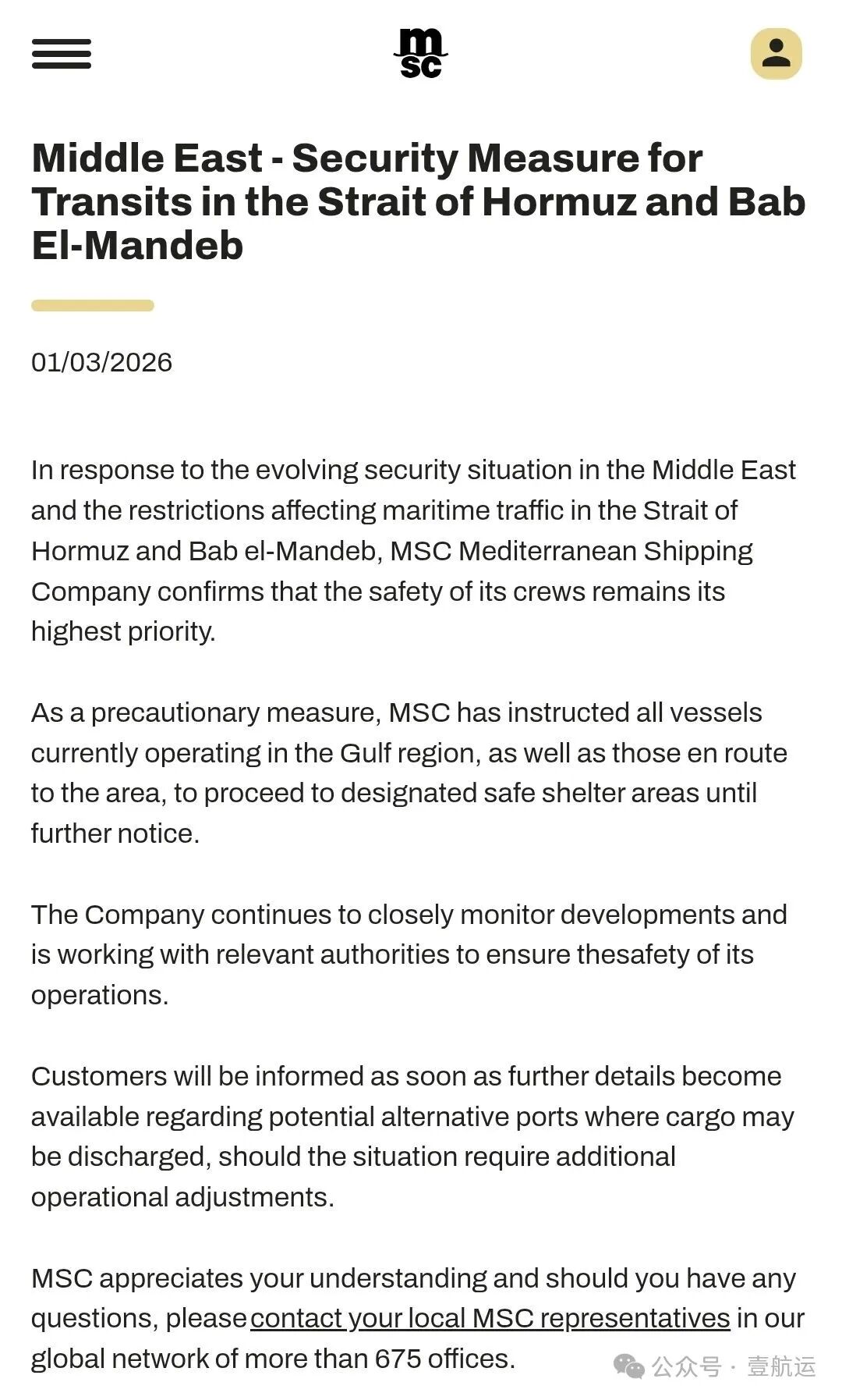 公告称:受中东地区安全局势持续恶化影响,霍尔木兹海峡与曼德海峡航行受限,MSC地中海航运已要求目前在阿拉伯湾水域运营、以及正驶往该区域的所有船舶,暂时前往指定的安全避险水域停泊,直至另行通知。