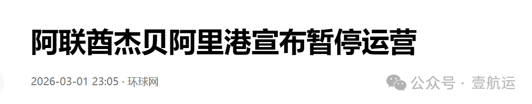 据壹航运最新获悉:当地时间周日(3月1日),阿联酋迪拜环球港务集团3月1日发布公告称,鉴于近期区域局势发展,并遵照相关政府部门的指示,中东地区最大的人工港、集装箱吞吐量最大港口杰贝阿里港Jebel Ali已暂停运营!