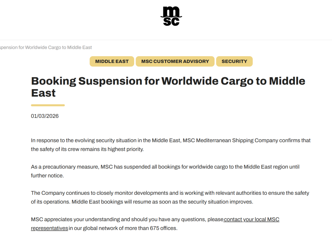 同时,MSC在另一份声明中表示,已暂停所有全球范围内前往中东地区的货物预订,直至另行通知。