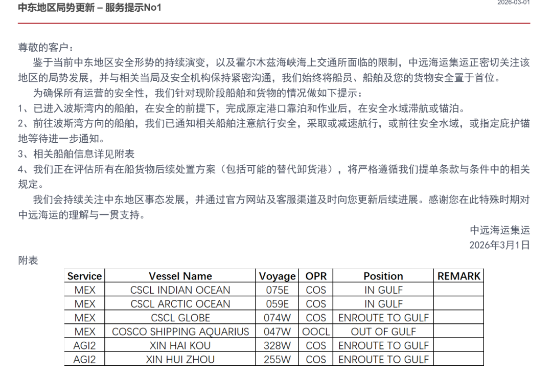 同日,中远海运集运在一份声明中称,鉴于当前中东地区安全形势的持续演变,以及霍尔木兹海峡海上交通所面临的限制,中远海运集运正密切关注该地区的局势发展,并与相关当局及安全机构保持紧密沟通,我们始终将船员、船舶及您的货物安全置于首位。为确保所有运营的安全性,我们针对现阶段船舶和货物的情况做如下提示:
