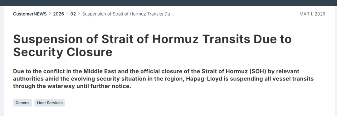 3月1日,赫伯罗特发表声明称,由于中东冲突以及相关当局在地区安全形势不断变化的情况下正式关闭霍尔木兹海峡,赫伯罗特公司暂停所有船舶通过该水道,直至另行通知。
