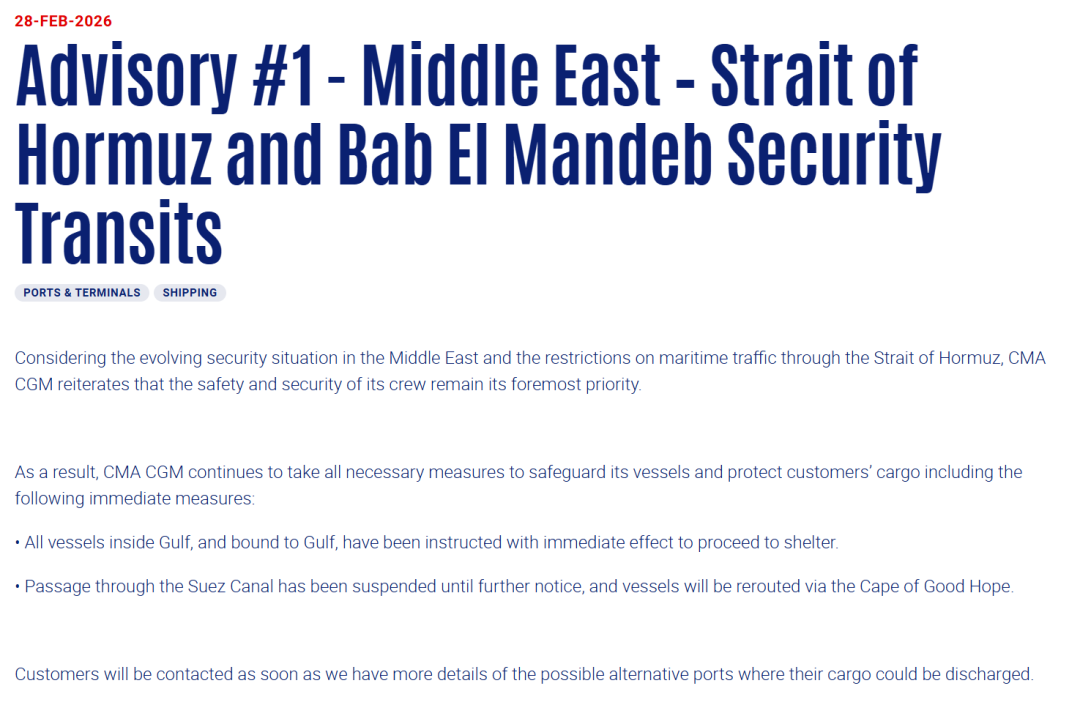 2月28日,达飞海运发表声明称,鉴于中东地区不断变化的安全形势以及霍尔木兹海峡海上交通的限制,公司重申,船员的安全保障仍然是其首要任务。因此,达飞轮船继续采取一切必要措施保障船舶安全和客户货物安全,包括以下立即采取的措施: