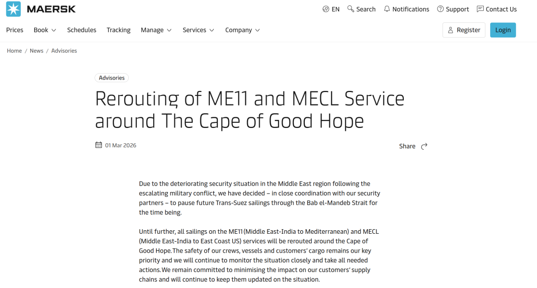 3月1日,马士基表示,由于中东地区军事冲突升级,安全形势恶化,公司在与安全伙伴密切协调后决定,暂时暂停未来经由曼德海峡的跨苏伊士运河航行。