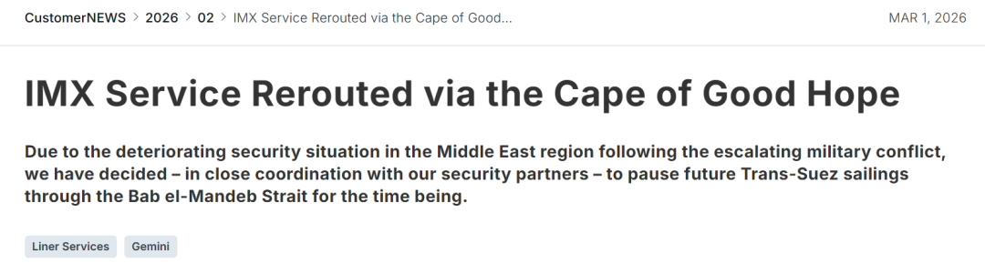 “我们始终致力于最大程度地减少对客户供应链的影响,并将持续向客户通报最新情况。一旦局势稳定且安全状况允许,我们将继续优先使用跨苏伊士运河航线运营IMX服务,因为这是我们为客户提供服务最快捷、最可持续、最高效的方式。”
