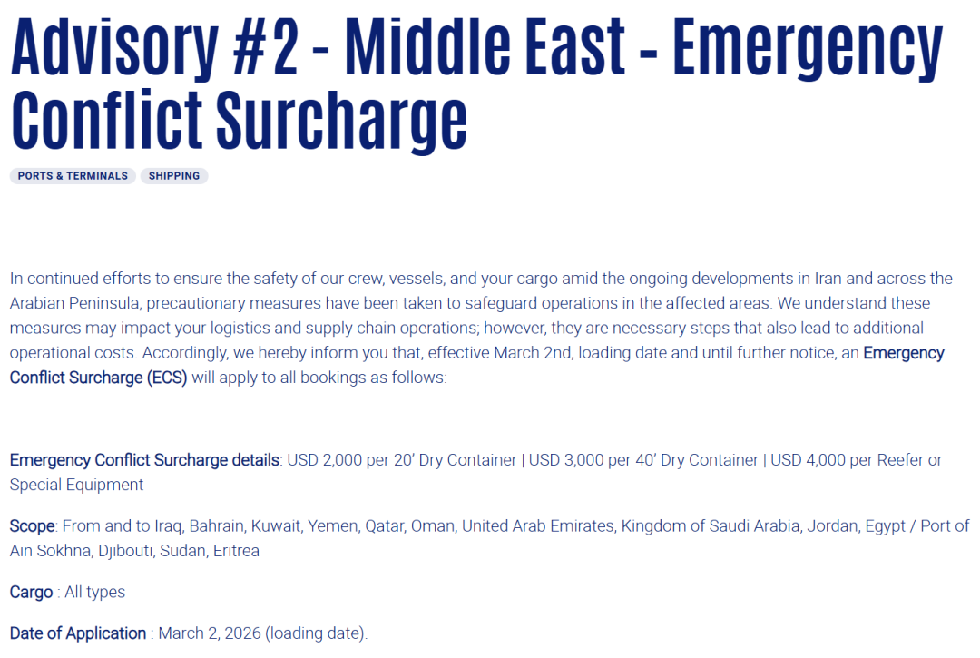 紧急冲突附加费申请日期为2026年3月2日(装运日期),涵盖所有货物类型,地点范围包括往返伊拉克、巴林、科威特、也门、卡塔尔、阿曼、阿拉伯联合酋长国、沙特阿拉伯王国、约旦、埃及/艾因苏赫纳港、吉布提、苏丹、厄立特里亚。