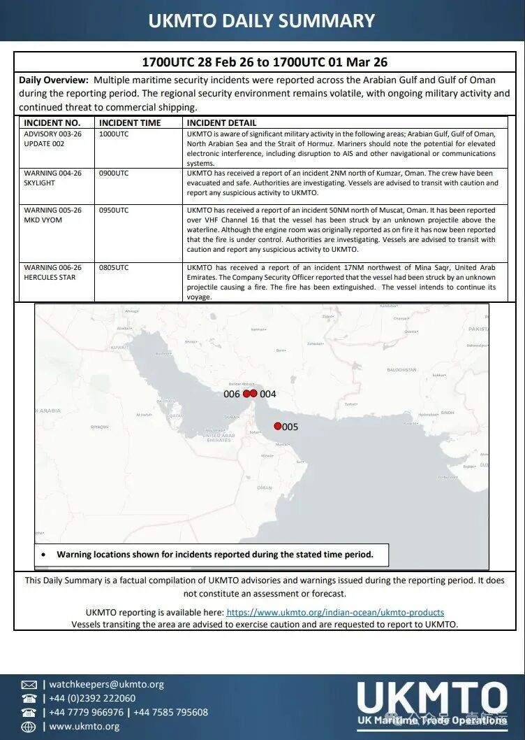 英国海事贸易行动办公室(英国海事贸易行动办公室,UKMTO)迪拜中心于2月28日0700 UTC发布警告称,伊朗当局通过VHF无线电16频道向过境船舶广播,声称霍尔木兹海峡已关闭。但UKMTO强调,该广播并非合法关闭航道的官方程序。