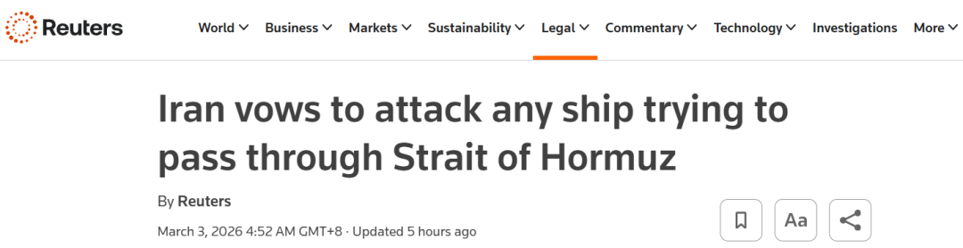 油市此前已高度聚焦伊朗与美国、以色列之间的对峙风险,担忧冲突升级为全面战争,从而冲击供应链、动摇区域稳定。如今,随着海峡封锁言论升级,市场风险溢价或进一步扩大。
