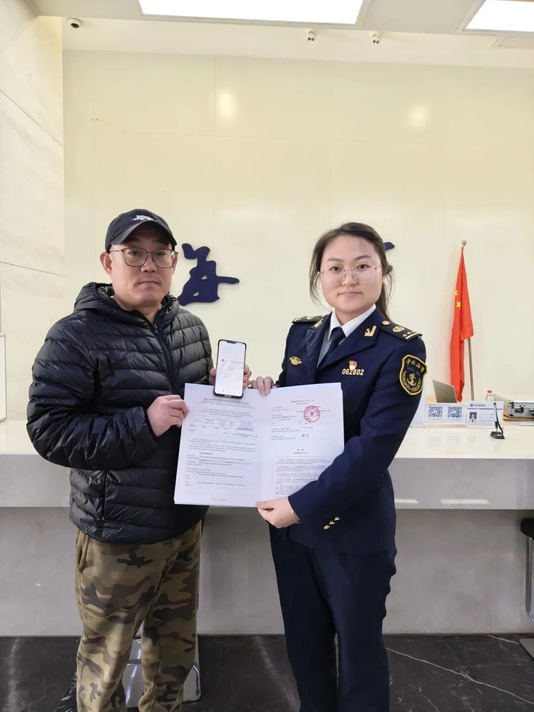 据悉,该轮计划于次日在舟山接受海事劳工检查,急需两本证书随船备查,政务中心“排忧解难窗口”迅速启动应急响应机制,打破常规审批流程,将原本需7个工作日办结的事项压缩至1个工作日内完成,最大限度提升审批效能。证书办结后,工作人员随即指导船方通过“海事通APP”查看电子证照。
