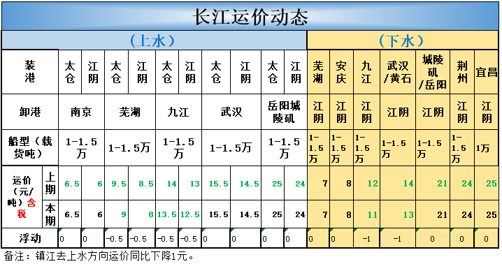 北方五港方向进江各类型船舶运价均上涨1元;