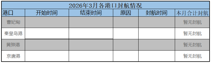 2026年3月3日,本月初始,北方各大港口暂无封航,具体如下。