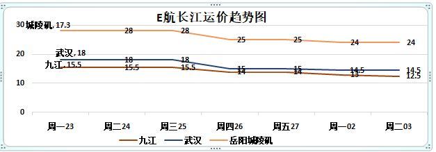 长江下水九江武汉运价均下跌1元,其他航线运价暂维持稳定;
