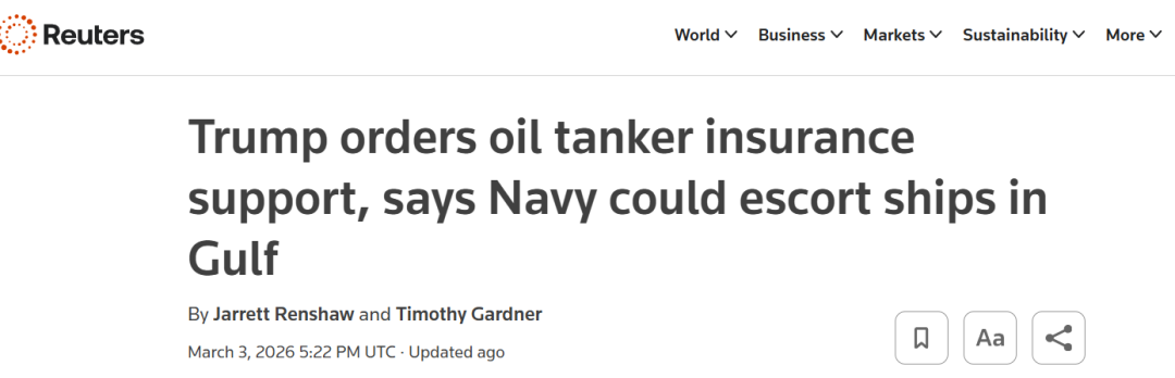 风险溢价的传导正在重塑成本结构。随着战事升级,海湾区域战争险保费大幅跳升,部分保险机构缩减甚至暂停承保。高昂的保险成本直接抬升通航门槛,部分船东选择延迟装货或规避航线。美国通过DFC提供政治风险保险与金融担保,本质上是试图修补“保险失灵”这一关键环节。历史上,无论是两伊战争期间的护航行动,还是“9·11”后政府介入保险市场,都曾出现类似政策路径。