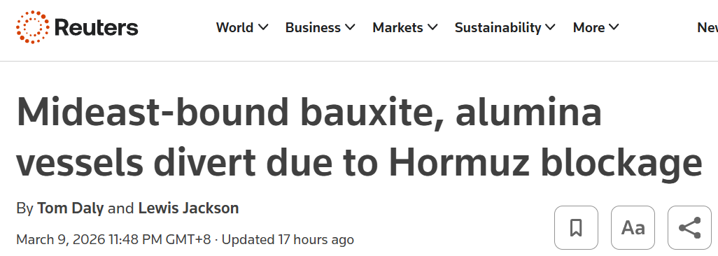 受局势影响,巴林唯一的铝冶炼企业Aluminium Bahrain已于上周宣布合同进入不可抗力状态。市场人士认为,如果霍尔木兹海峡航运持续受阻,中东铝产业链可能面临更大冲击,同时相关大宗商品贸易流向也可能被迫重新调整。