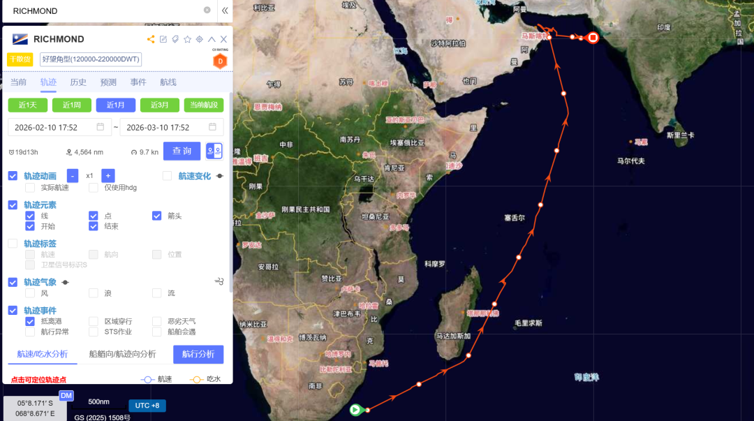 船舶动态显示,“Richmond”轮于1月24日从塞拉利昂弗里敦启航,目的地为阿联酋哈利法港。但随着中东局势在3月初迅速升级,该船在阿曼海岸附近突然停航。随后,“Richmond”轮一度调头向东驶向印度方向,但目前再次停航,新的目的地尚未明确。