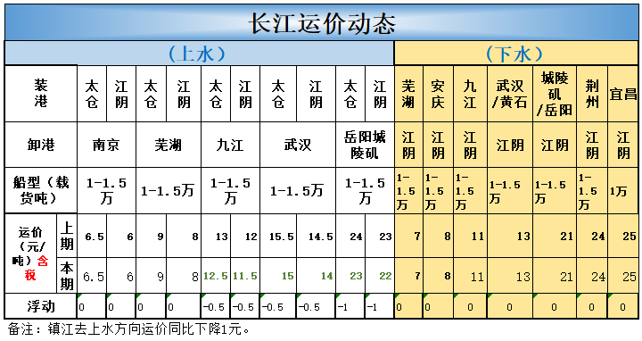 北方五港方向进江大船运价上涨1元;中小船舶运价均无变化;