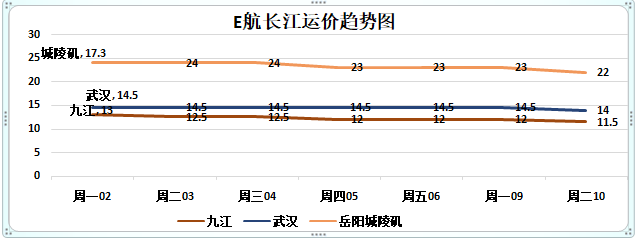 江阴到城陵矶运价下跌1元为22元/吨。