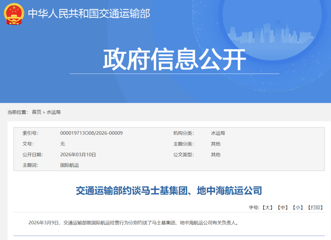 2026年3月9日,交通运输部就国际航运经营行为分别约谈了马士基集团、地中海航运公司有关负责人。但交通运输部未公布具体约谈细节。