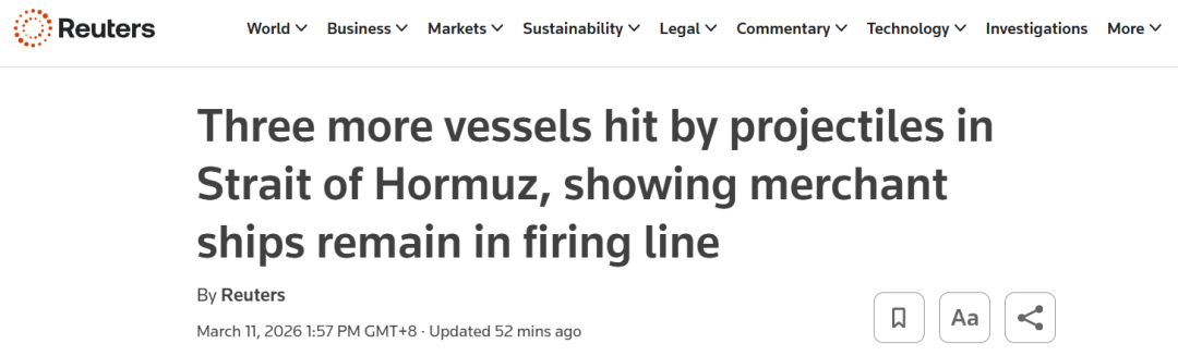 3月11日,多家海事安全与风险机构披露,当天在霍尔木兹海峡及其周边海域又有三艘商船遭不明来源的抛射物袭击。至此,自2月下旬伊朗冲突升级以来,该区域遭袭船舶数量已至少达到14艘,地区航运安全形势持续恶化。