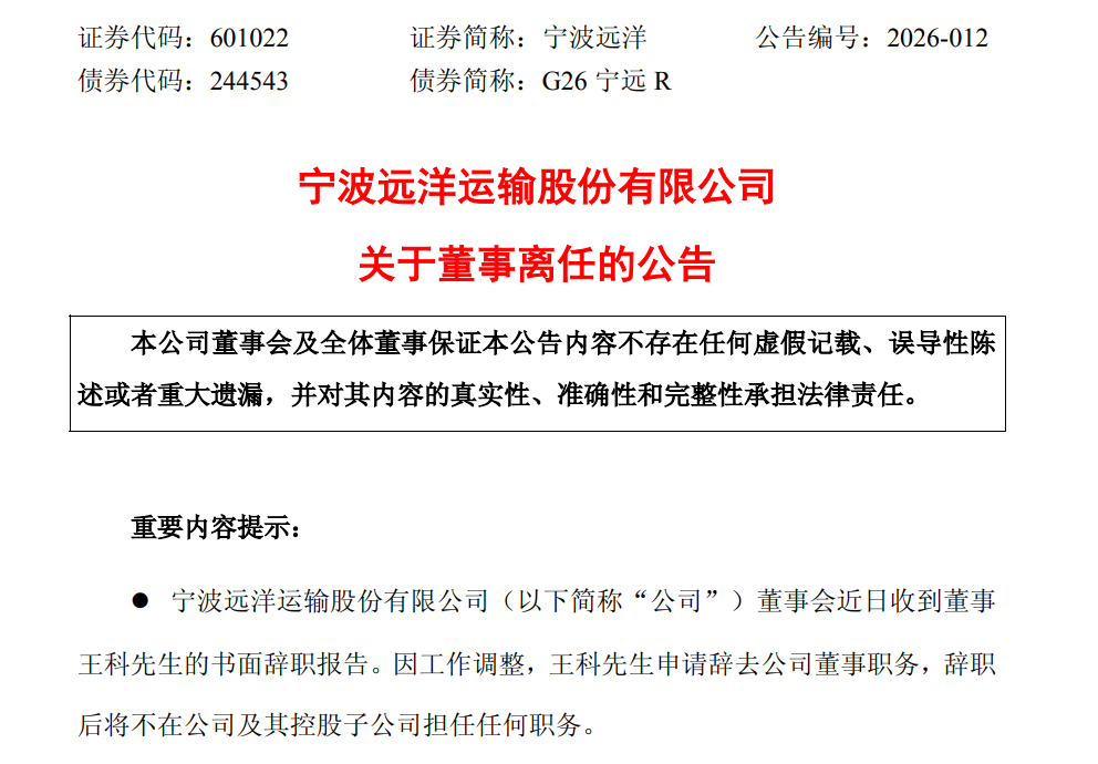 6、宁波远洋董事王科辞职!