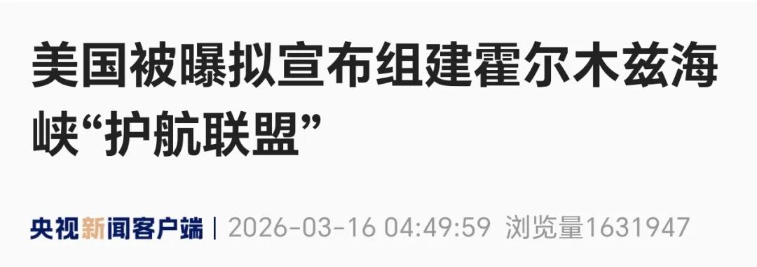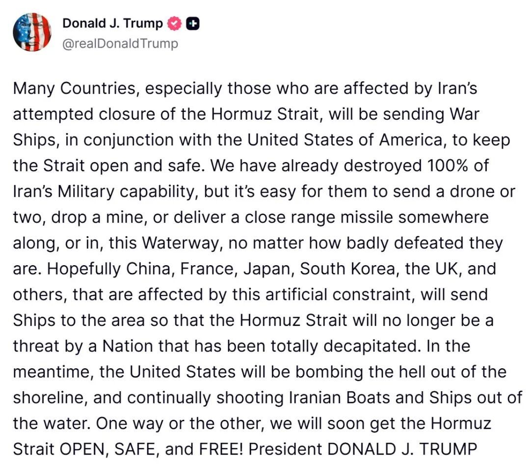 最新获悉:当地时间3月14日,美国总统特朗普在社交媒体发文称,希望英国、法国、韩国等国家向霍尔木兹海峡派遣军舰,共同组建霍尔木兹海峡“护航联盟”!