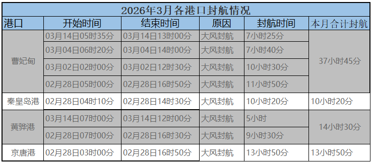2026年3月16日,近期曹妃甸、黄骅港有短时间大风封航,其他北方港口均暂无封航,具体如下。